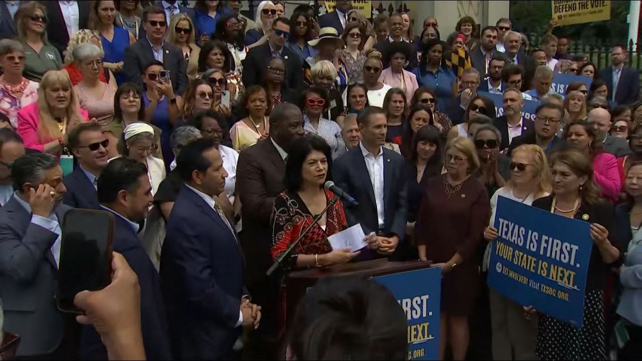 Texas Senate Democrats fleeing their state to hold up Republican redistricting speak to the press in Boston.